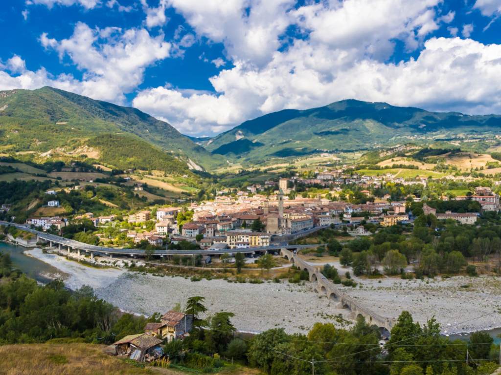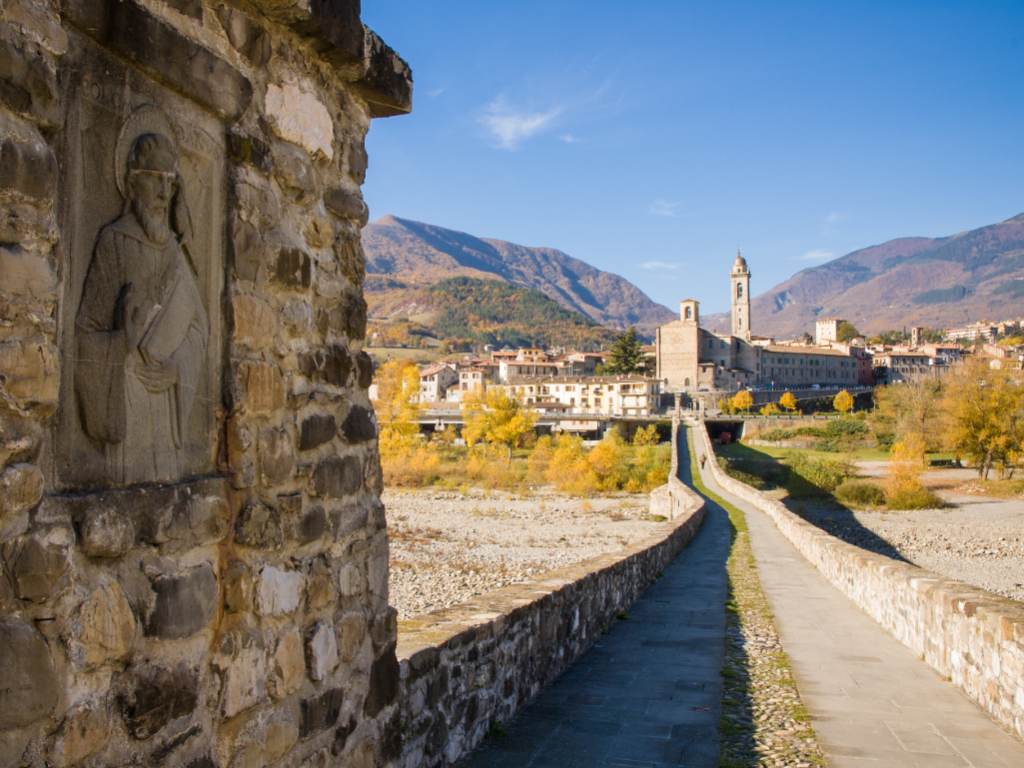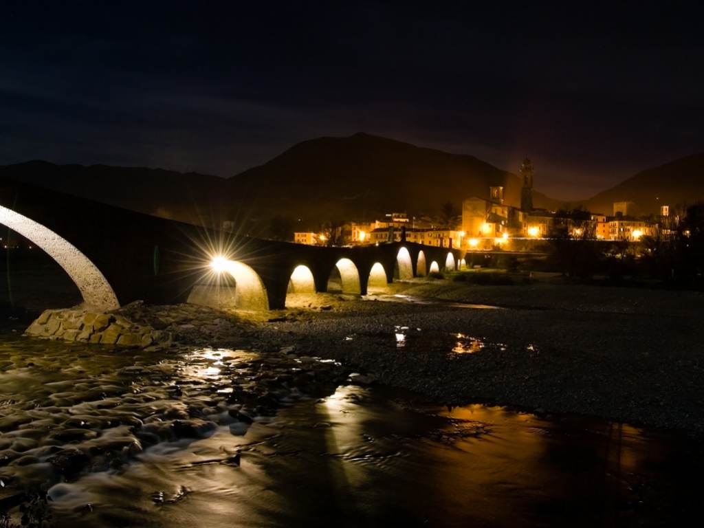 Le Ponte Vecchio (le Vieux Pont), qu'on appelle aussi le Ponte Gobbo (le Pont Bossu) à cause de la forme irrégulière de ses onze arcades, est un des symboles de la ville de Bobbio. On a des témoignages de son existence à partir de l'an 1196, mais il y a de fortes raisons de croire qu'il remonte à l'époque romaine puisque la rive droite de la rivière (Trebbia) était déjà alors le siège d'activités variées: c'était là, par exemple, que se trouvaient les salines, exploitées aussi par les Lombards, et le fourneau du ruisseau Gambado qui fonctionnait depuis le Vème Siècle. Jusqu'au XVème Siècle, le pont n'avait que quelques arches; il en compta définitivement 11 seulement à partir du siècle successif.