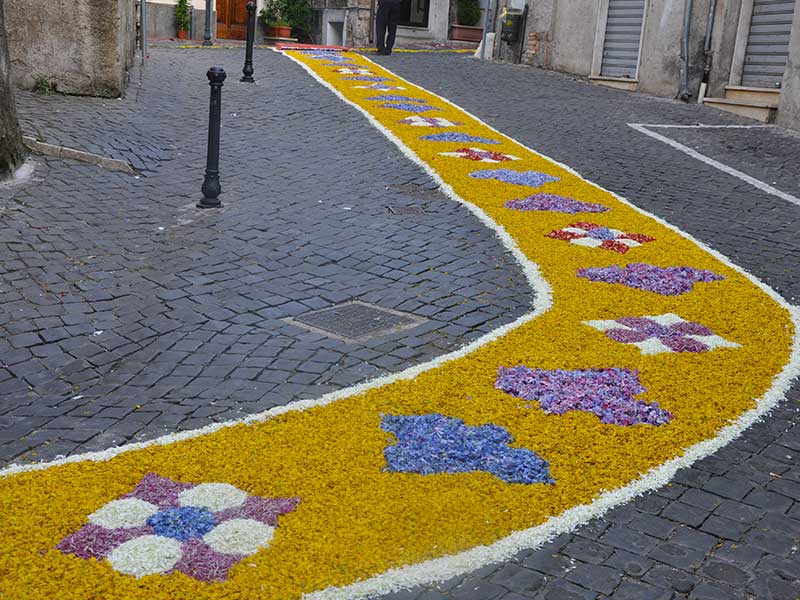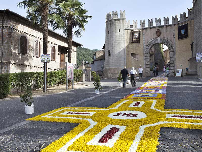 The tourists who visit Genazzano on the first Sunday of July will realize with astonishment that the roads, hamlets and squares are covered with a multi-coloured carpet of flowers for almost over 1500 square meters. It is not a dream nor a spell, but a reality that has been repeated since 1883, when Cardinal Vincenzo Vannutelli established the first celebrations with a solemn procession and published the articles of association of the Apostleship of Prayer in honour of the Sacred Heart of Jesus.