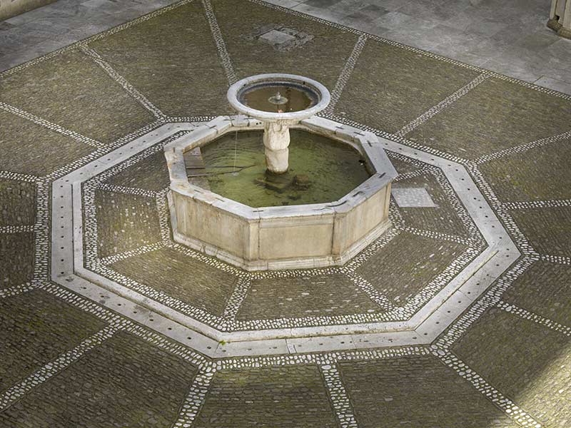 In the courtyard there is a well and an octagonal fountain, made in the period of Filippo Colonna, as well as the "Roman" aqueduct from which the water was brought to the village. The remains of which still exist in the current communal garden, once private park of the family. Filippo restored the aqueduct built by Martino V, which conveyed the headwaters of the hill St. Andrea to the fountain of the Palace and, also to the fountains in the public squares where the entire population gathered. The final part of the aqueduct, also used as a bridge to access the castle, was destroyed by the bombing during the Second World War.