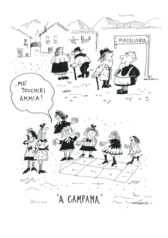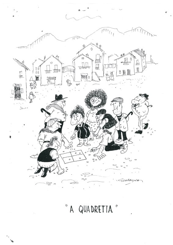 “A CAMPANA” Tipo di gioco: è un gioco che si svolge all’aperto ma può essere fatto anche in luogo chiuso, purché sia molto spazioso. Giocatori: si parte da un minimo di due. Materiale occorrente: una pietra calcarea o un gessetto e una pietra sottile per fare i lanci. Modalità del gioco: si disegnano a terra tre quadrati in verticale, l’uno sull’altro numerandoli da 1 a 3. Poi, seguono attaccati due quadrati posizionati a seguito dei primi 3, ma disegnati, che a partire dal centro del numero 3 si estendono verso destra e sinistra e saranno rispettivamente il numero 4 e il numero 5. Seguirà, in corrispondenza del numero 3 e successivo al 4 e 5, un quadrato col numero 6. A seguire, nella stessa posizione del 4 e del 5, e successivo al numero 6, si disegneranno due quadrati con rispettivamente il 7 e l’8. Seguirà centrale, in corrispondenza dei primi tre e del 6, il quadrato numero 9 e si chiuderà con un cappello di riposo. Regole: con la conta si stabilisce l’ordine dei giocatori. Il primo lancia la pietra sul quadrato numero 1, poi comincia a saltare, con una gamba sola, sui rimanenti quadrati, badando di non saltare sul quadrato dove è stata tirata la pietra e proseguirà fino al cappello del riposo. Arrivato al cappello del riposo (un mezzo cerchio con il diametro il doppio del lato di uno dei quadrati numerati) il giocatore si gira e ripercorre sempre saltando su una gamba il percorso all’indietro. Fermandosi nella casella prima di quella dove si trova la pietra, la recupera sempre in equilibrio sulla gamba e salta il quadrato numero 1 (visto che è al primo tiro), senza toccarlo. In seguito, il giocatore procederà tirando la pietra sul quadrato numero2 e andrà avanti con le stesse modalità del primo giro. Ovviamente, al secondo giro, sarà il quadrato numero 2 a essere evitato. Particolarità: il giocatore perde il turno se: a) la pietra esce fuori o non va nel numero stabilito; b) mette tutti e due i piedi per terra; c) nel saltare tocca la linea di demarcazione dei quadrati.