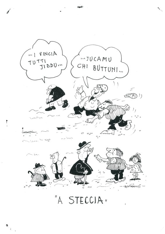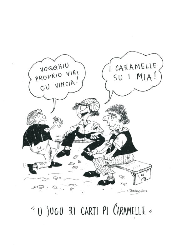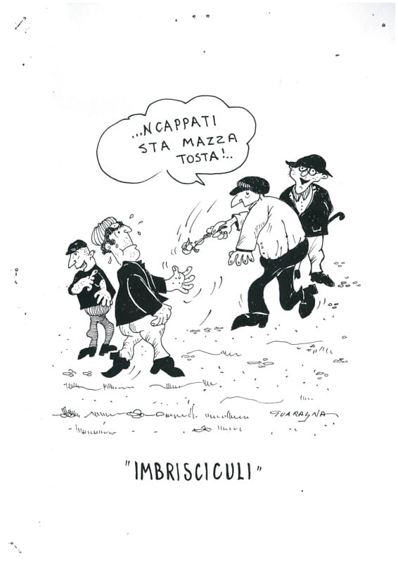 “I BRISCICULI” Tipo di gioco: necessita di 2 tappi di birra, un fazzoletto. Giocatori: tre giocatori. Materiale: 2 tappi di birra, e un fazzoletto per farlo a forma di mazza. Descrizione del gioco: mediante la sorte, si stabilisce chi deve fare il re, chi deve tirare con la mazza, chi deve tirare in aria i tappi (brisciculi). Risultato: se i due tappi cadendo rimangono tutti e due coperti, prende il posto del re; se cadendo rimangono girati con l’interno rivolto in su, prende il posto di chi tira la mazza; se, invece, cadendo rimangono uno girato su, uno girato coperto, si verifica “u briscicula”. A questo punto, il re dà la condanna e la mazza esegue i colpi sulla mano tesa, che possono variare da 5 a un massimo di 20, salate o non salate. Un gioco molto crudele.