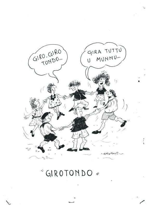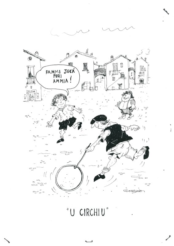 “U CIRCHIU” Tipo di gioco: si gioca all’aperto in luoghi possibilmente pianeggianti. Giocatori: si può giocare già in due, ma se si è di più è ancora più divertente. Materiale occorrente: un cerchio di media grandezza (si usava quello delle botti vecchie o quello delle biciclette rotte), un bastone di metallo dalla lunghezza massima di un metro con l’estremità ricurva per accompagnare il cerchio. Descrizione del gioco: i giocatori si dispongono lungo la linea di partenza. Al via, i giocatori devono guidare il cerchio con il bastone ricurvo, lungo le linee disegnate in precedenza sull’asfalto, badando a non invadere la linea dell’altro giocatore. Regole: si viene espulsi se si invade la linea dell’altro giocatore e vince chi arriva primo al traguardo.