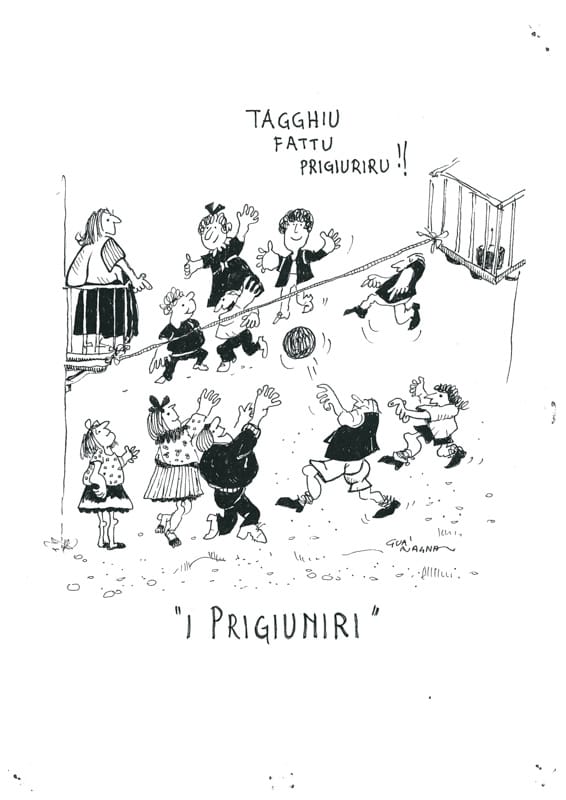 “PRIGIUNIRI” Tipo di gioco: un numero pari di ragazzi, per formare due squadre. Giocatori: un massimo di 10, 5 da una parte e 5 dall’altra. Materiale: una piazza con una linea trasversale di divisione. Descrizione del gioco: ogni giocatore individua il suo avversario e, con i piedi sulla linea di divisione, cerca di tirarlo nel suo campo. Chi ci riesce li fa prigionieri, si sistemano all’estremità della piazza e i compagni, con abilità, senza essere toccati e correndo, li devono liberare.