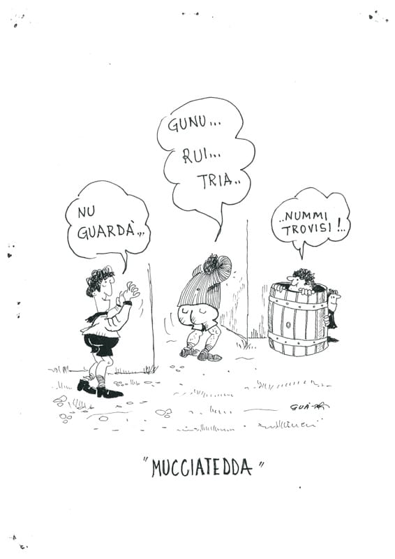 “A MUCCIATEDDA” Tipo di gioco: si gioca all’aperto, adatto a bambini e adolescenti. Giocatori: un minimo di quattro. Materiale occorrente: nessuno. Come si gioca: i ragazzi raccolti in cerchio fanno la conta per stabilire chi deve trovare i partecipanti che si nascondono. Il ragazzo sorteggiato, con la faccia rivolta verso un muro, comincia a contare fino ad arrivare al numero stabilito. Nel frattempo che il ragazzo conta, gli altri giocatori devono trovarsi un rifugio dove nascondersi per non essere trovati dal ragazzo che fa la conta. Infatti, appena finisce di contare, il ragazzo sorteggiato comincia a cercare gli altri partecipanti nascosti. I ragazzi nascosti si devono liberare cercando di toccare il punto dove il ragazzo ha fatto la conta e dire ad alta voce “tana libera per me”. Chi riesce a liberarsi evita la conta, di sicuro, per il turno successivo. Il ragazzo che viene scoperto per primo senza riuscire a liberarsi prende il posto di chi fa la conta. L’ultimo ragazzo che riesce a liberarsi può liberare tutti dicendo ”tana libera per tutti”. In questo modo libera tutti i ragazzi catturati e il ragazzo sorteggiato riprenderà la conta. Regole: commette fallo e il gioco ricomincia se: a) il ragazzo della conta sta sempre vicino alla tana; b) se tutti i giocatori riescono a toccare la tana; c) se il ragazzo della conta non riesce a toccare la tana pur avendo scoperto il nascondiglio del giocatore. N.B.: la tana è il muro dove il ragazzo sorteggiato fa la conta.
